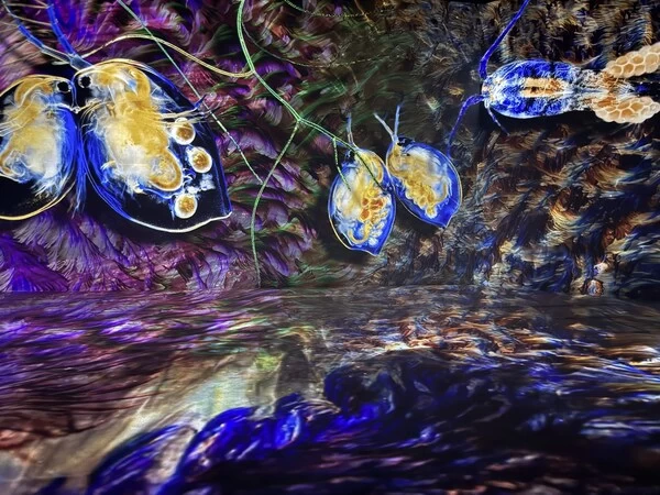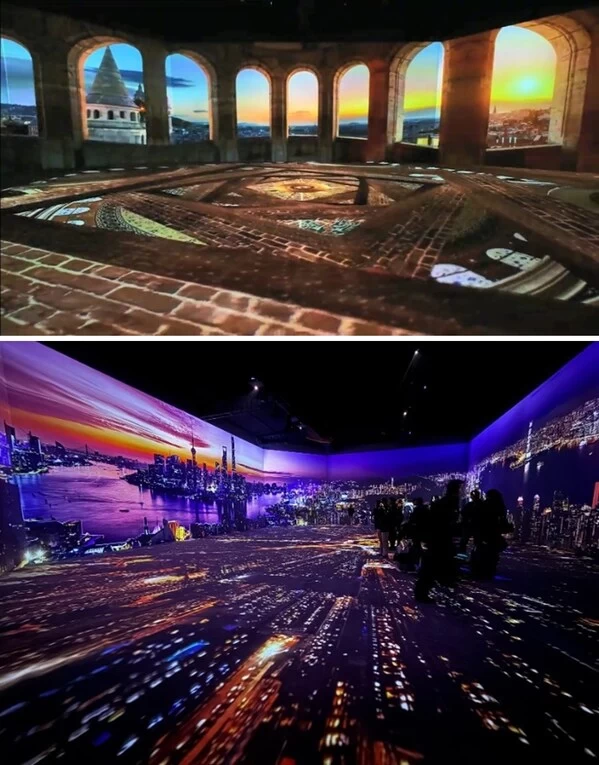 该空间以"宇宙共鸣箱"为设计理念,构建了一个全包围六面投影的540°沉浸式视听空间。观众走进展厅,不再是旁观者,而成为了"共鸣体"的一部分,在动态光影与环绕音效中全身心感受影像的魅力。通过13台FP-ZUH6000投影机的多机联动,实现了六面墙体与地面的巧妙衔接与超广视角投影,创造出一种无限延伸的错觉:一望无际的海洋、层次分明的洞窟空间、壮观的火山喷发、如同万花镜一般无限延伸旋转的城市……在这里,影像的边界被打破,万物之光在空间中交织、碰撞、共鸣,为观众带来一场从物理空间到精神世界的沉浸之旅。