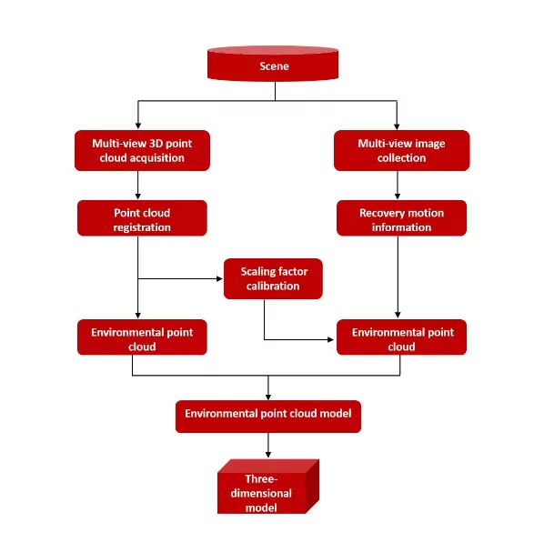 获得初始信息后,从图像序列计算得到运动信息,经过稠密重建,获得环境3D点云,同时在此过程中完成尺度因子的标定。然后在融合点云后得到最终的环境点云模型,经表面重建后得到三维场景模型。