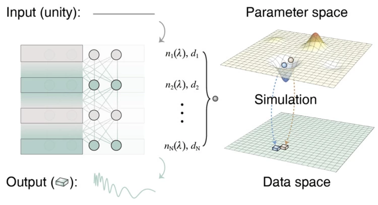 复享光学将光学逆问题研究主体(多层薄膜)视为神经网络来构建映射关系,并进行优化训练。这是全球首次将反向传播算法引入薄膜优化过程,在复享深度光谱™技术框架下开创性地发展了薄膜神经网络技术,极大地缩短了百层薄膜厚度的优化时间,相比于传统微扰差分的方法,其单次优化时间缩短为原来的2%。