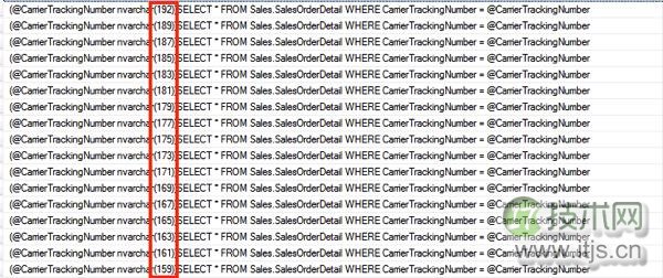 我们是聪明的开发者,因此SQL语句本身被参数化,因为ADO.NET框架是地球上最棒的框架,我们使用System.Data.SqlClient.SqlParameterCollection类的AddWithValue方法来提供实际的参数值。我在WHLIE循环里运行那个SQL语句100次,总用不同长度赋予参数值。在Sales.SalesOrderDetail表里CarrierTrackingNumber列定义为NVARCHAR(25)。因此我们可以在基于我们提供的不同字符长度上有上至25个不同数据类型的参数。现在让我们检查下我们SQL语句执行后的计划缓存。
