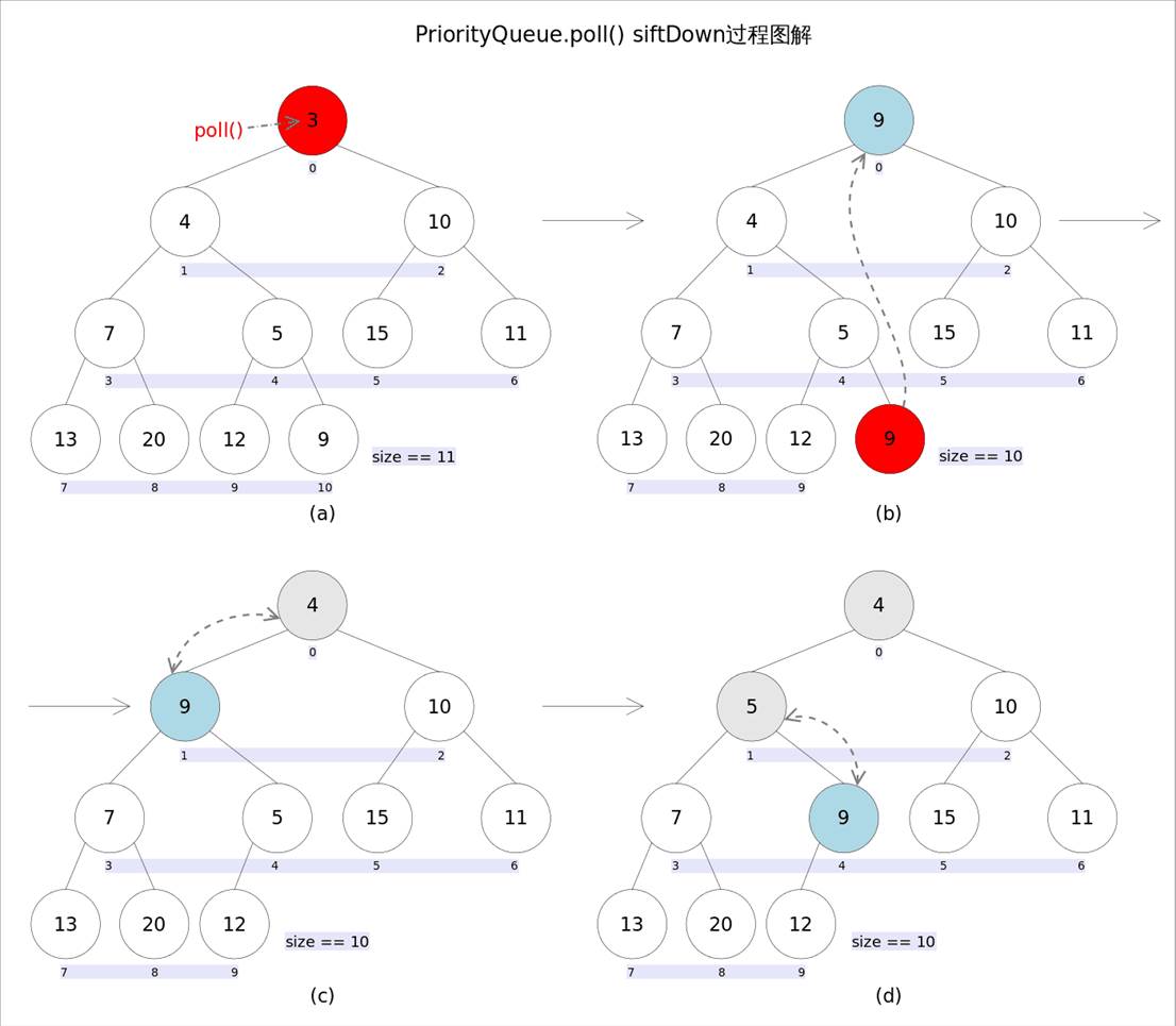 remove()和poll()方法的语义也完全相同,都是获取并删除队首元素,区别是当方法失败时前者抛出异常,后者返回null。由于删除操作会改变队列的结构,为维护小顶堆的性质,需要进行必要的调整。